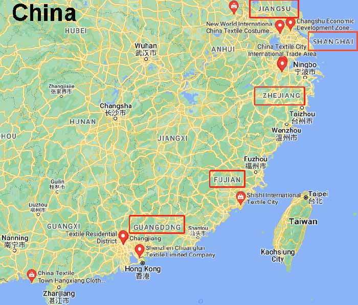 China’s textile industry cluster is mainly concentrated in Guangdong, Zhejiang, Jiangsu, Shanghai, and Fujian provinces, which have lots of textile manufacturing and processing factories. Any fabric you want to import, such as silk, cotton, polyester, knitting, etc., can be found in these areas.